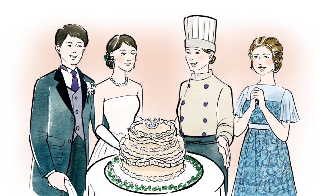 そして迎えた結婚式当日。無事、完成したケーキが会場に運ばれてホッとしていたところ、担当プロデューサーから声をかけられました。「このケーキを作ってくれたパティシエさんに、直接お礼を伝えたいとおふたりがおっしゃっています」。すぐに会場へ向かうと、そこにはご新郎とご新婦、そして妹様の姿が。「難しい注文なのに、ちゃんと叶えてくれて、本当にありがとうございます」。その言葉に、パティシエは胸がいっぱいになりました。